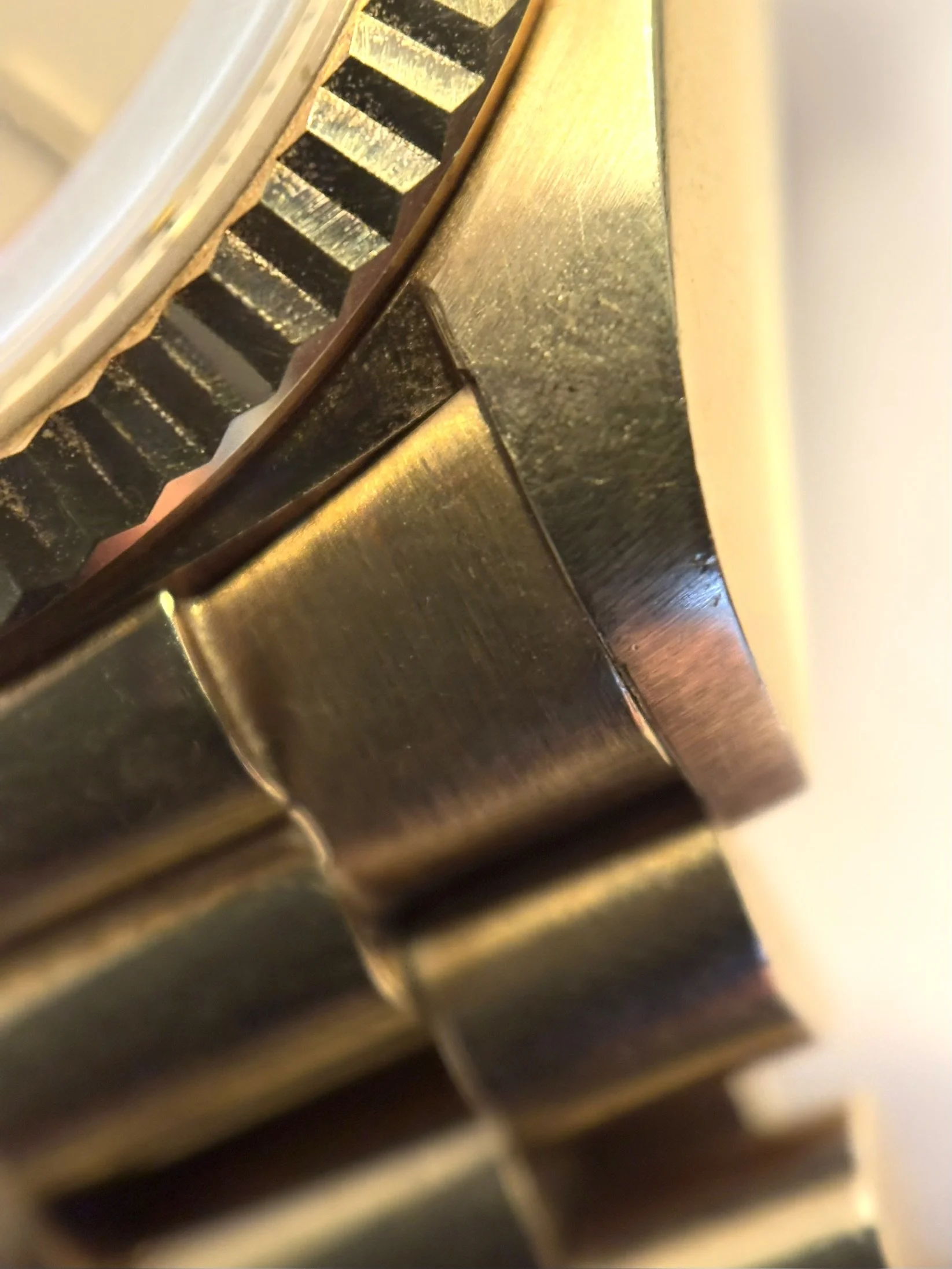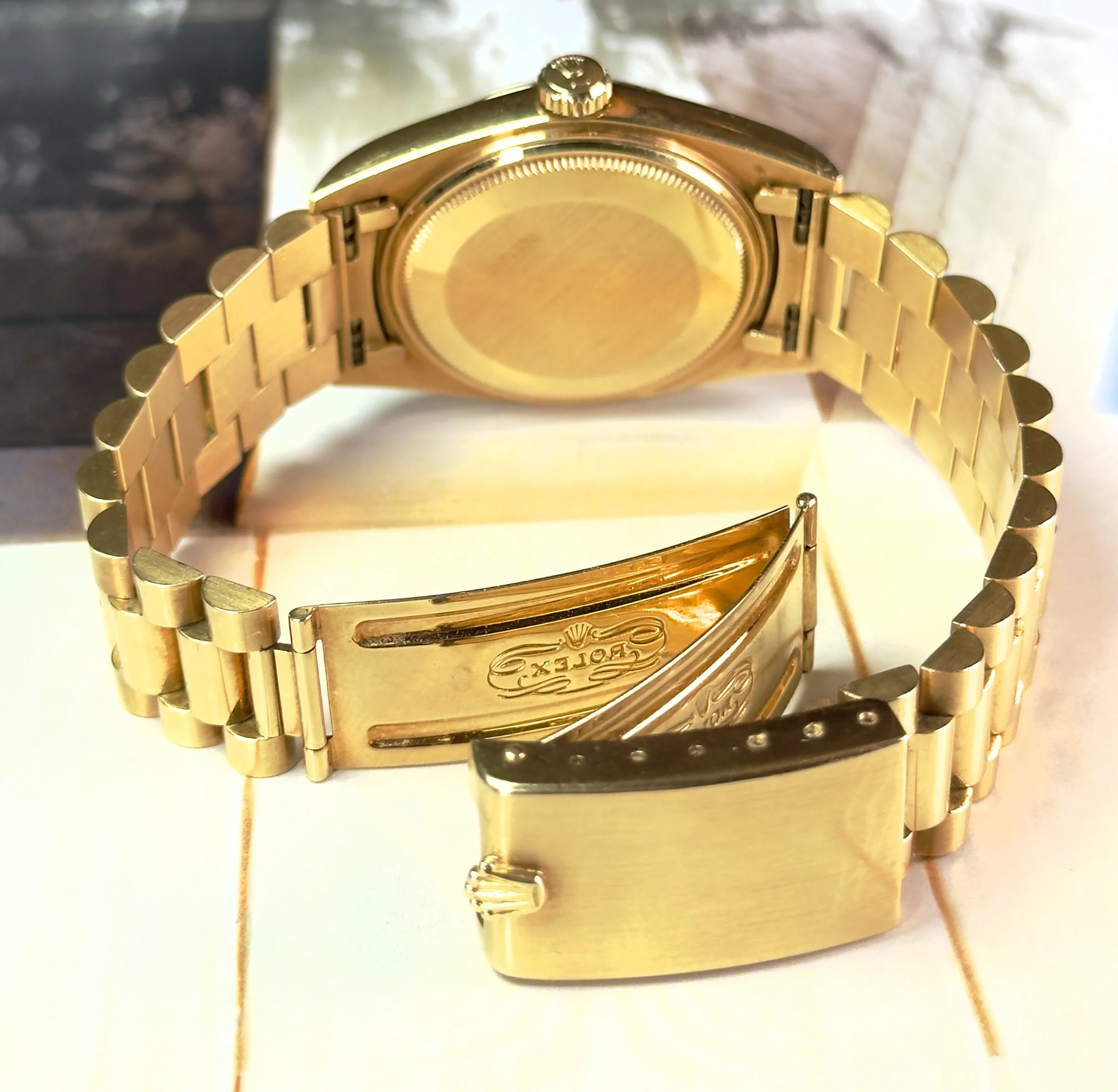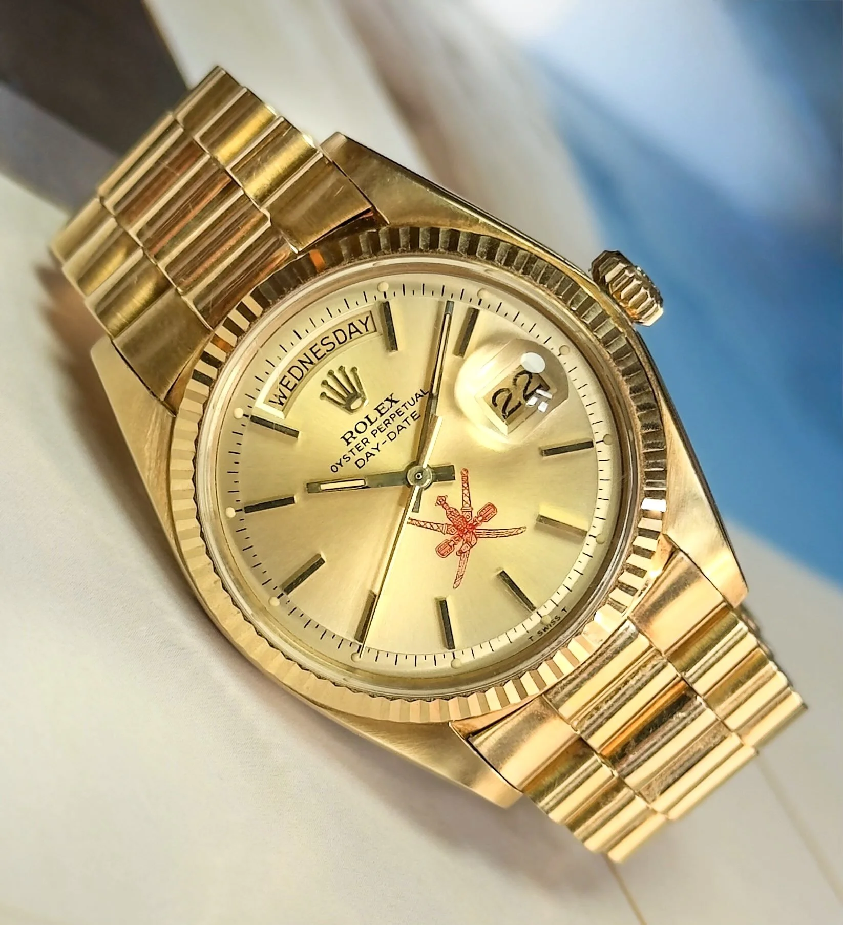 This Day Date is incredible. These rare versions of the 1803 Day Date were commissioned by the Sultan of Oman and supplied through the prestigious London-based jeweller Asprey. The Khanjar emblem on the dial is a highly collectible and a valuable variant. These don’t come up for sale very often and certainly not in this condition!