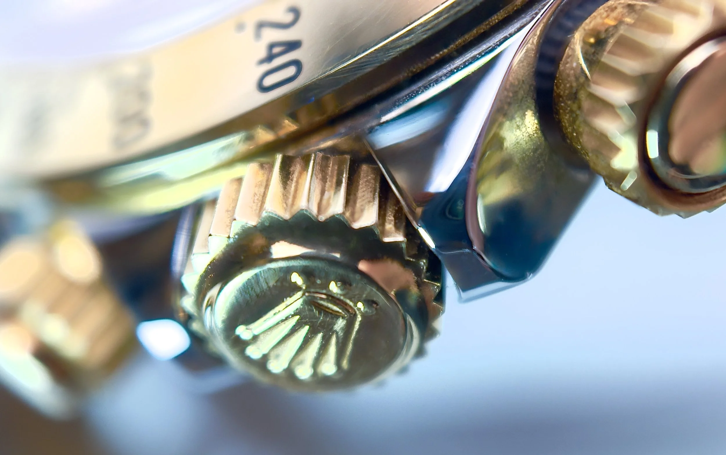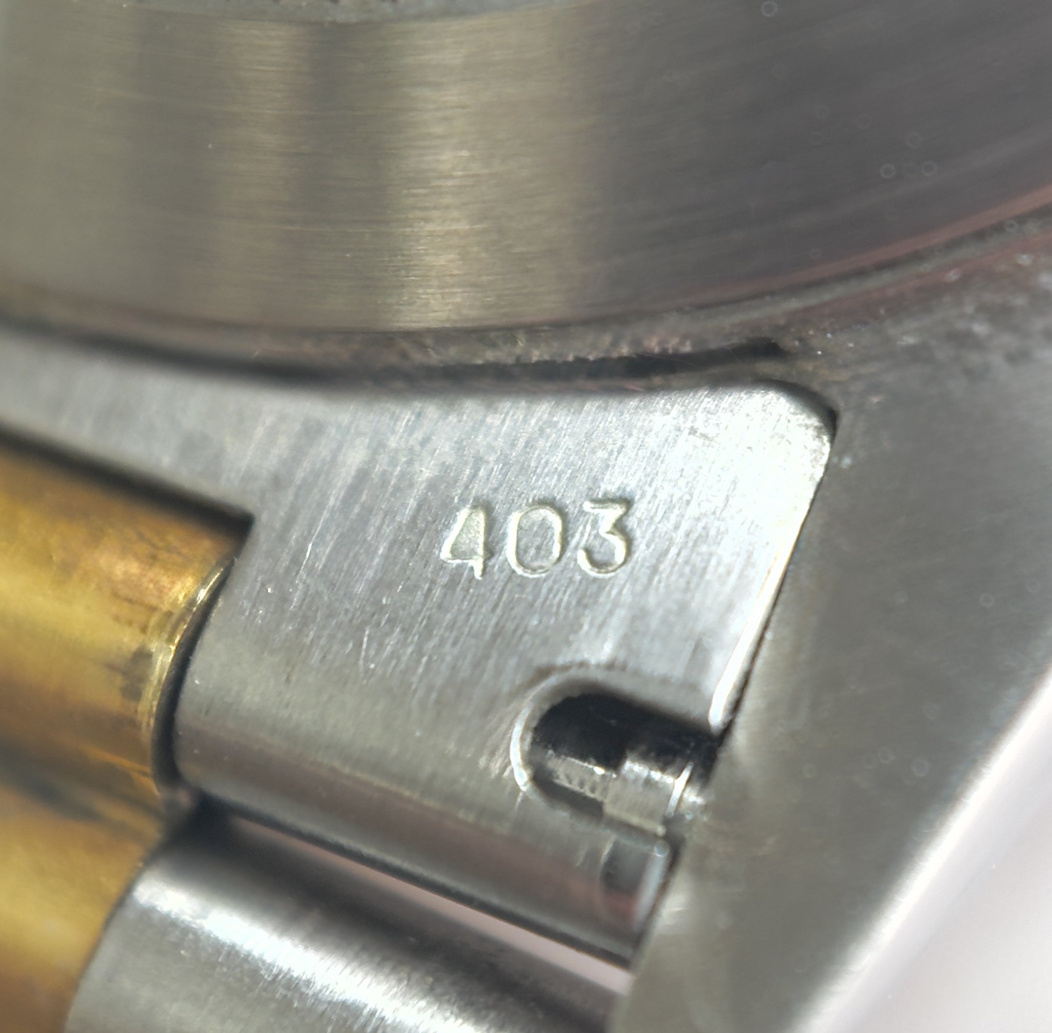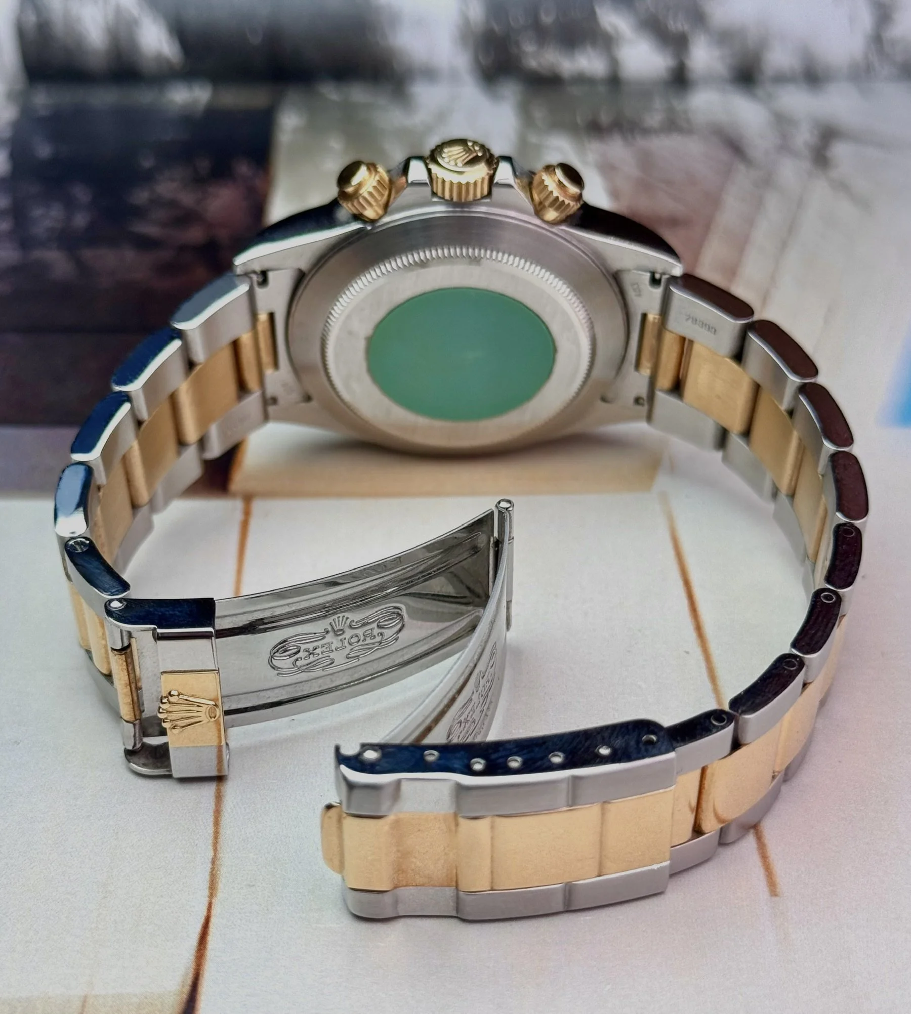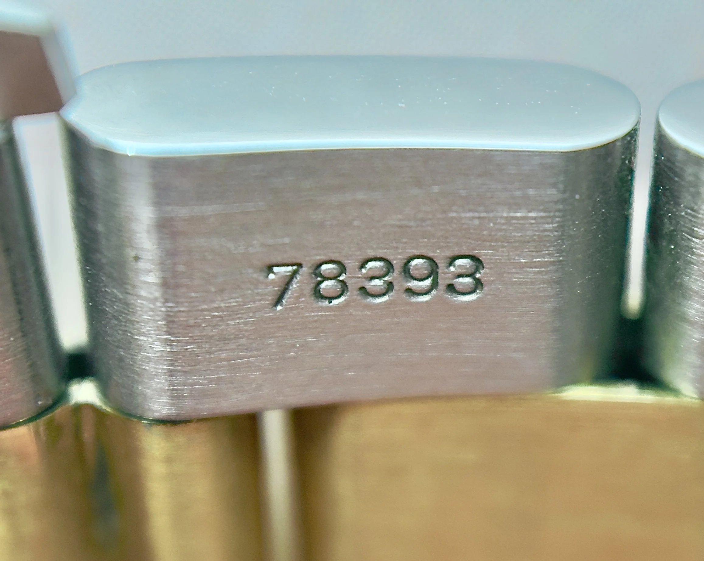 The whole watch seems to be previously unpolished with razor sharp edges everywhere, light scratches from handling and wear are present. One of the best bezels we’ve ever seen, again sharp and crisp edging with light scratches. Inverted 6 Champagne dial is in immaculate condition. The 78393 bracelet with 403 end links is crisp and sharp, light wear and surface scratches but clasp is still very stiff and no stretch in bracelet. The clasp code dates to 1995 as do the booklets and Rolex warranty certificate.